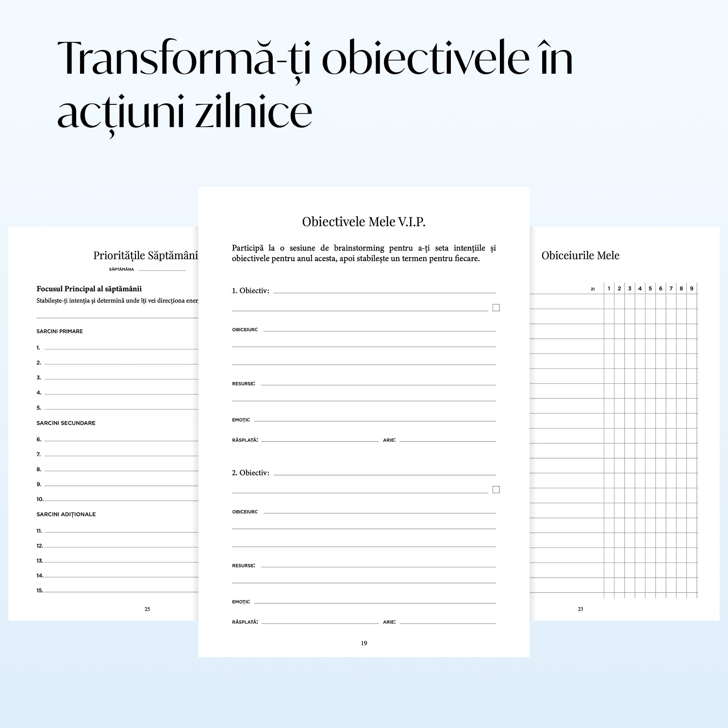Stabilirea obiectivelor (Goal Setting): 2 pagini dedicate clarificării tuturor obiectivelor tale și 4 pagini structurate pentru framework-ul VIP Goals, care te ajută să identifici ce contează cu adevărat și să transformi obiectivele în planuri clare de acțiune.